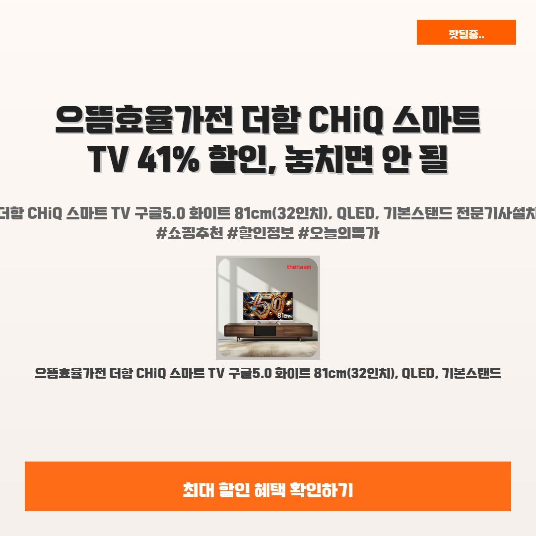🛍️ 이 포스팅은 네이버 쇼핑 커넥트 활동의 일환으로,판매 발생 시 수수료를 제공받습니다.오늘 소개할 제품은 단언컨데,,우수한 에너지 효율을 자랑하는 으뜸효율가전 더함 CHiQ 스마트 TV 구글5.0 화이트 81cm(32인치)입니다!집에서 간편하게 프리미엄 뷰잉 경험을 원하신다면, 이 스마트 TV는 정말 필수 아이템이 될 거예요.41% 할인이라는 이 놀라운 기회를 놓치면 후회할 수 있으니, 지금이 바로 구입할 타이밍입니다!이 TV를 통해 고화질의 QLED 화면과 구글5.0을 통해 더 풍성한 콘텐츠를 즐길 수 있어요.풀 옵션의 전문 설치 서비스까지 제공되니, 더 이상 고민할 이유가 없겠죠?정말 가성비 조차 고민할 필요가 없어요! 닫힌 TV 시장에서 여기에 주목해야 하는 이유, 지금 바로 확인해 보세요!※..